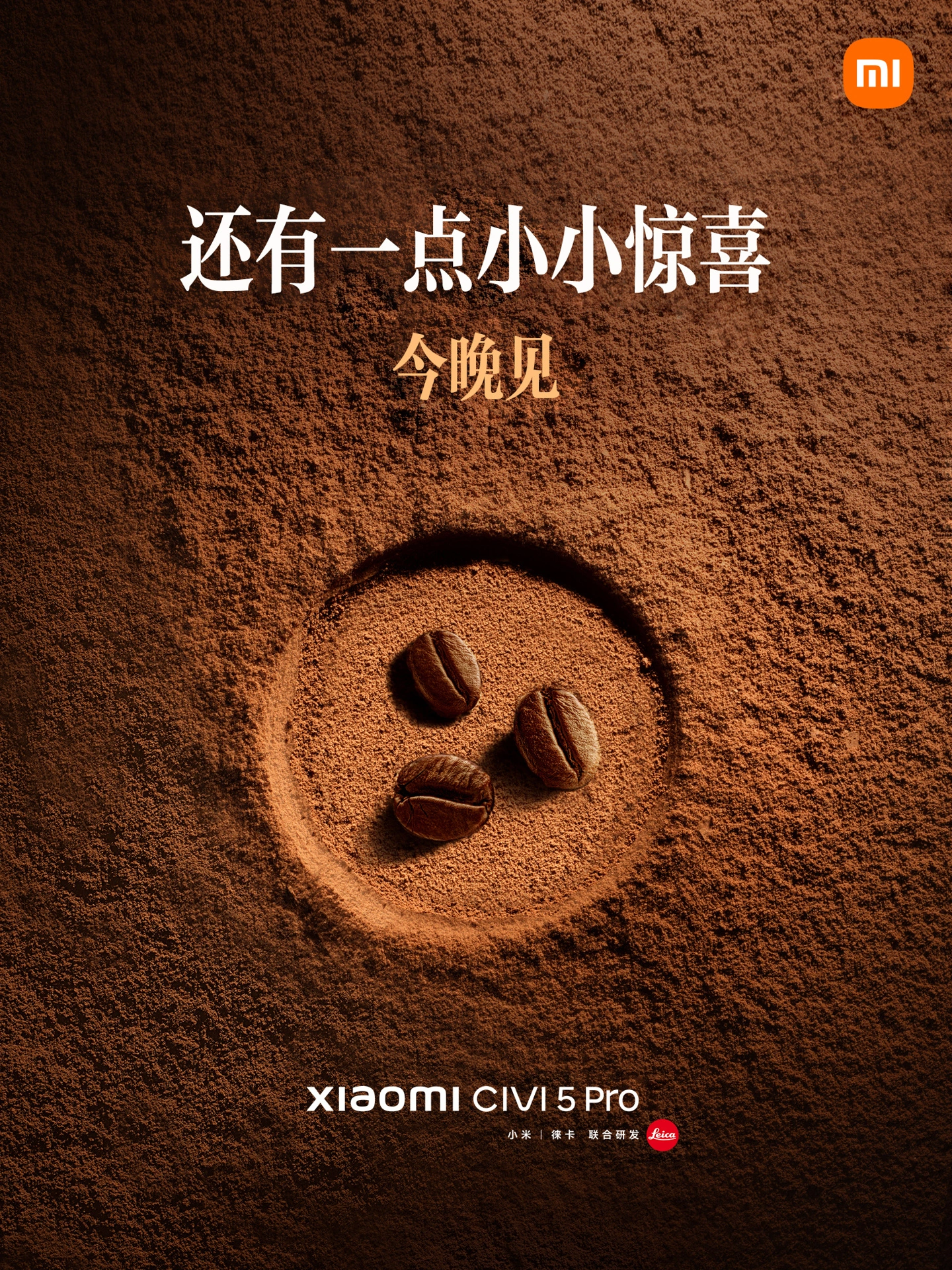 同时,他还晒出一张海报:背景为咖啡粉,画面主体为一个圆圈,内部用三枚咖啡豆组成酷似小米 Civi 5 Pro 后置相机模组的造型。