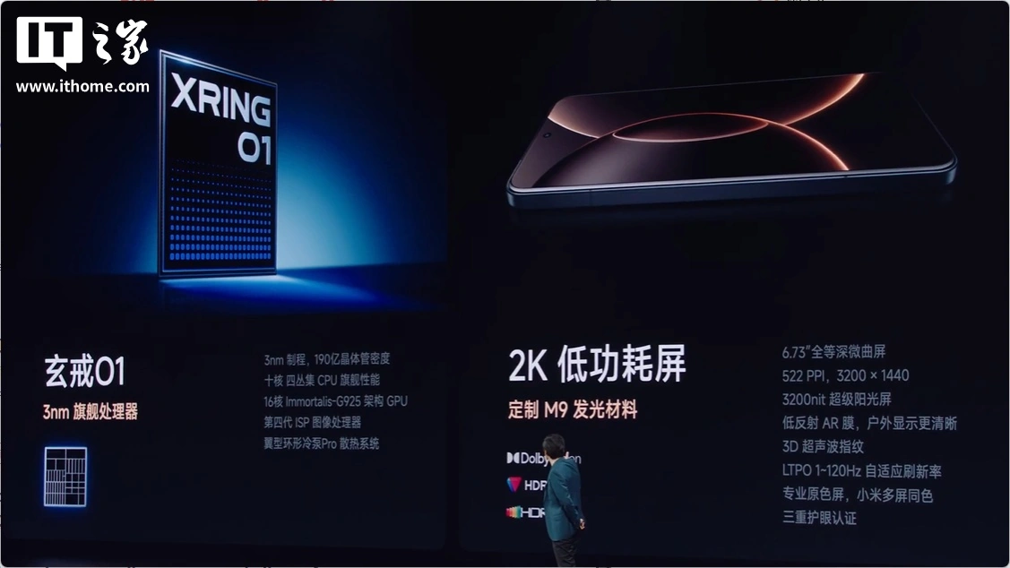 据IT之家了解,小米 15S Pro 搭载了小米最新发布的玄戒 O1 旗舰处理器,这款处理器采用了先进的 3nm 制程技术,拥有 190 亿晶体管,十核四丛集 CPU 架构确保了强大的计算能力,而 16 核 Immortalis-G925 架构 GPU 则为用户带来了流畅的图形处理体验。此外,翼型环形冷泵 Pro 散热系统进一步提升了手机的散热效果。