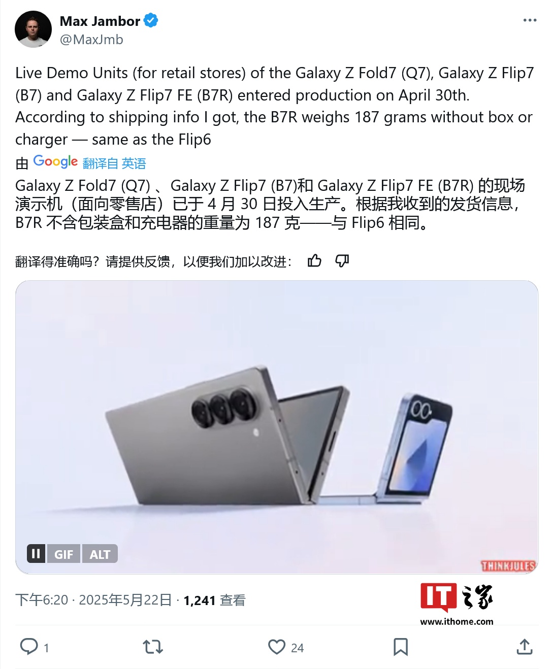 IT之家 5 月 23 日消息,消息源 MaxJambor 昨日(5 月 22 日)在 X 平台发布推文,曝料称三星 Galaxy Z Flip7 FE(B7R)已于 4 月 30 日开始,和 Galaxy Z Fold7(Q7)和 Galaxy Z Flip7(B7)同时开始量产,重量和 Galaxy Z Flip6 相同,为 187 克。