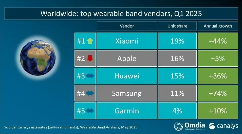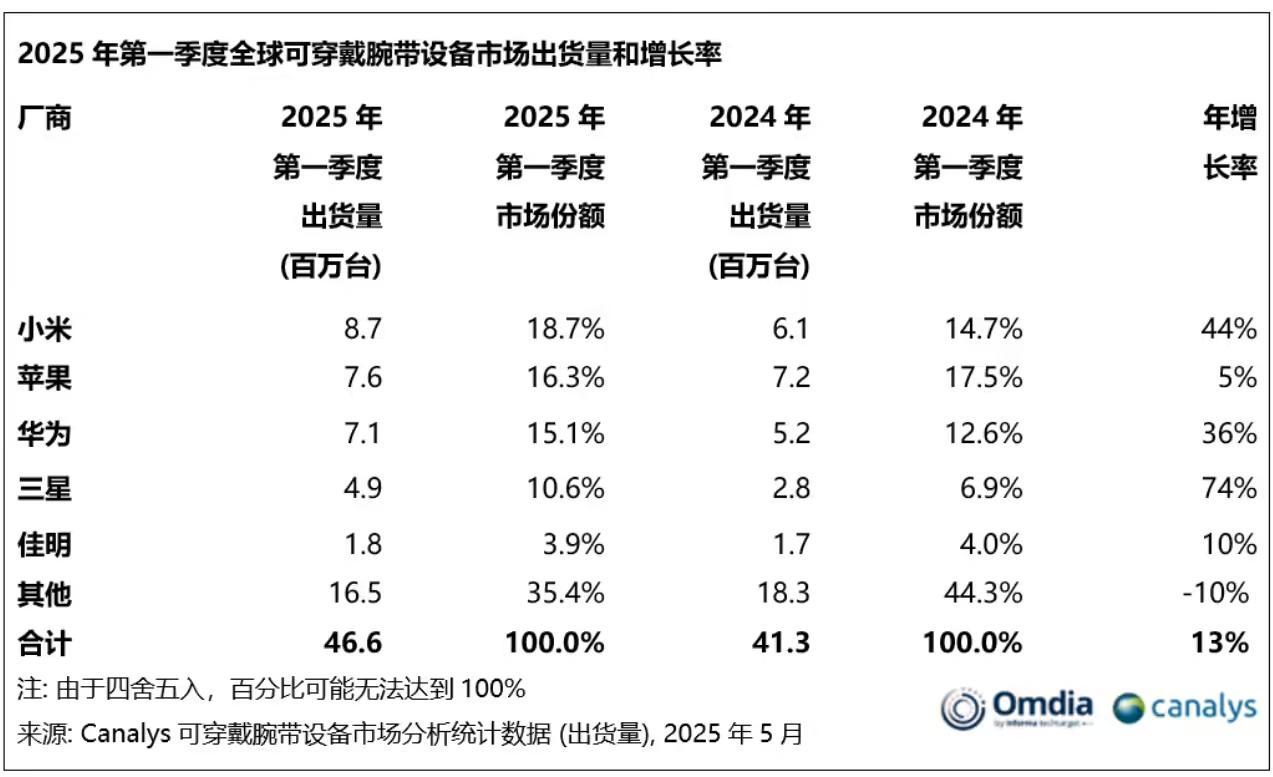 文章来源于互联网:凤凰网-Canalys:2025年Q1全球可穿戴腕带设备市场增长13%,小米跃居榜首