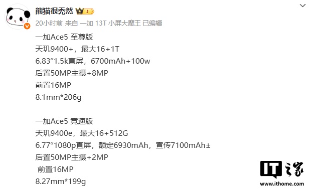 IT之家 5 月 23 日消息,一加 Ace 5 至尊版 / 竞速版手机将于 5 月 27 日 14:30 发布,博主 @熊猫很禿然 昨晚在社交平台曝光了这两款新机的主要规格。