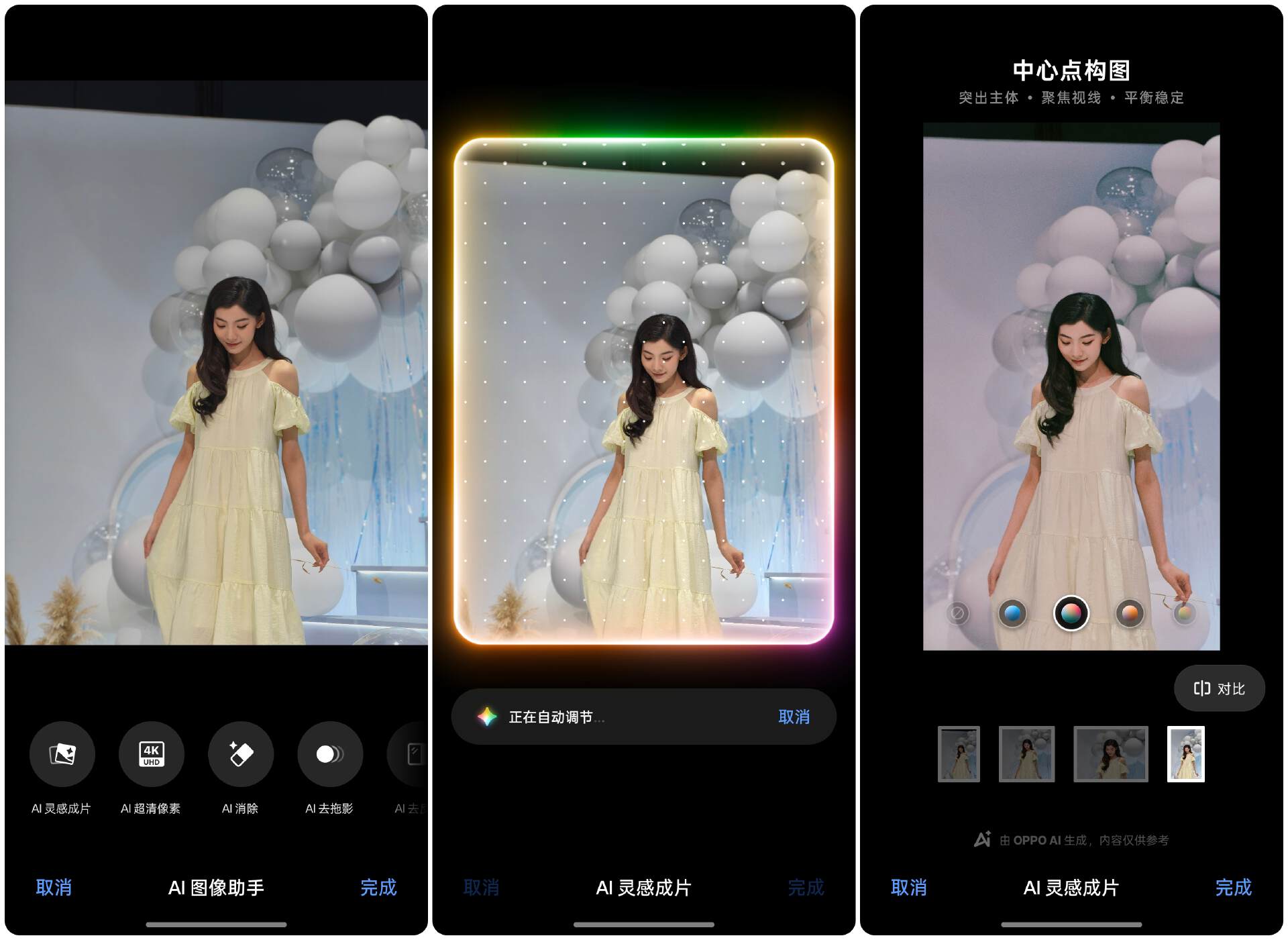 此外,OPPO Reno14 的 AI 图像助手,还带来了诸如 AI 灵感成片、AI 超清像素、AI 消除、AI 去拖影、AI 去反光等一系列功能。