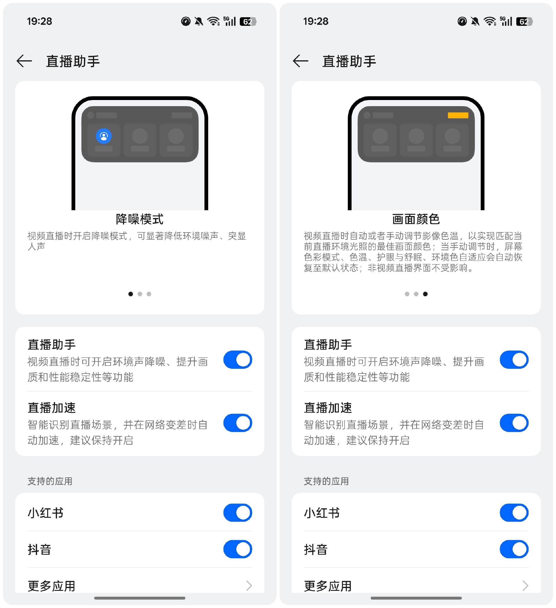 在系统内,OPPO Reno14 系列还新增了“直播助手”功能,开启后,直播中会打开环境声降噪、提升画质,以及性能稳定性。还可以直播加速,手动或自动调节影像色温等。