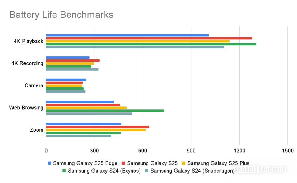 在统一亮度为 300 尼特的自动化电池测试中,S25 Edge 表现全面落后,在几乎所有测试项目中都不敌 S25,甚至在大多数类别中输给 S24 系列,仅在 Zoom 通话测试中略胜骁龙版 S24,与 Exynos 版本 S24 持平。