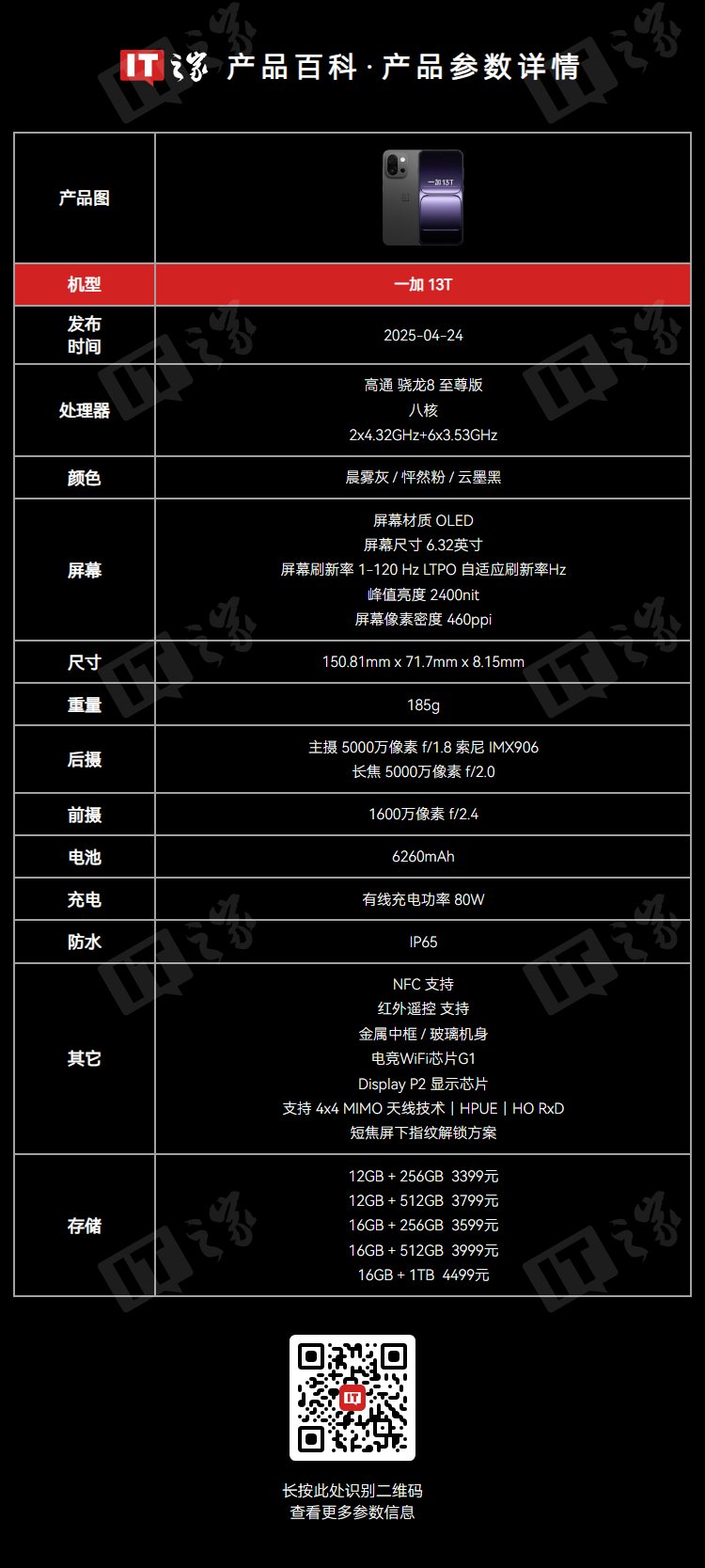 一加 13T 发布于 2025 年 4 月 24 日,骁龙 8 至尊版 + 6260mAh 电池,16+512GB 售价 3999 元。