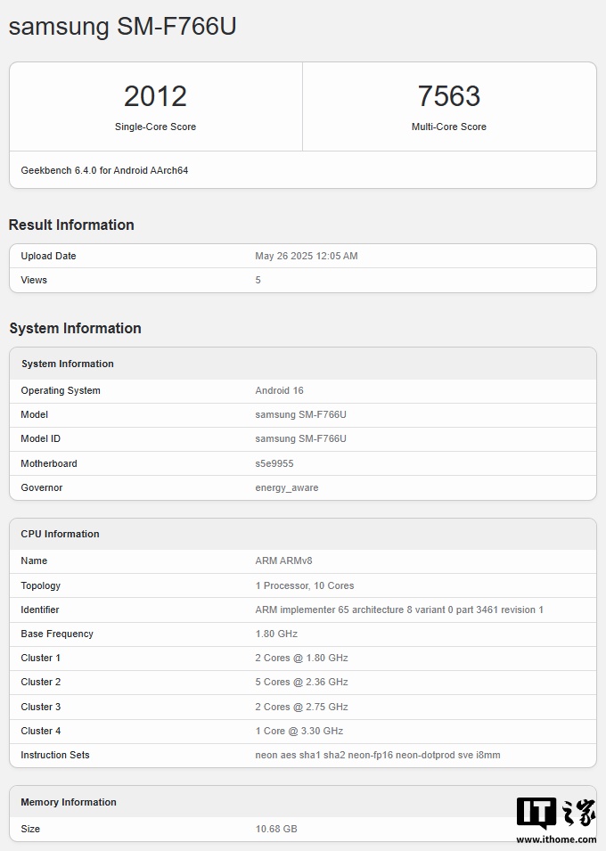 IT之家 5 月 26 日消息,一款型号为 SM-F766U 的三星手机今日现身 Geekbench,预计为 Galaxy Z Flip 7 折叠屏手机,搭载 Exynos 2500 处理器。