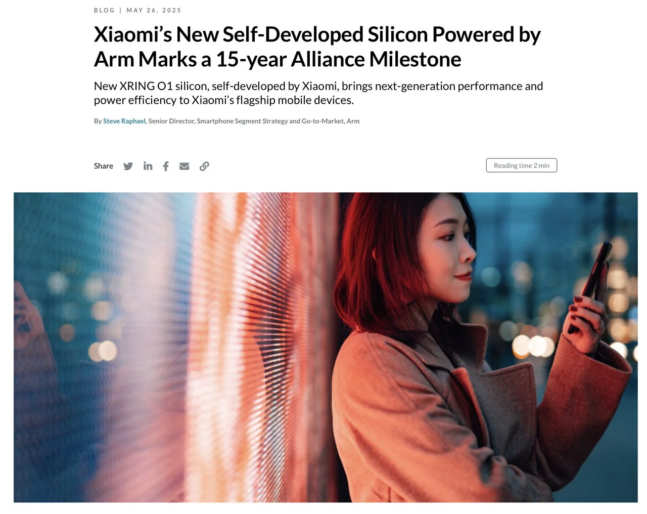 《Arm 发文祝贺小米玄戒 O1 芯片问世:标志着双方 15 年合作的重要里程碑》