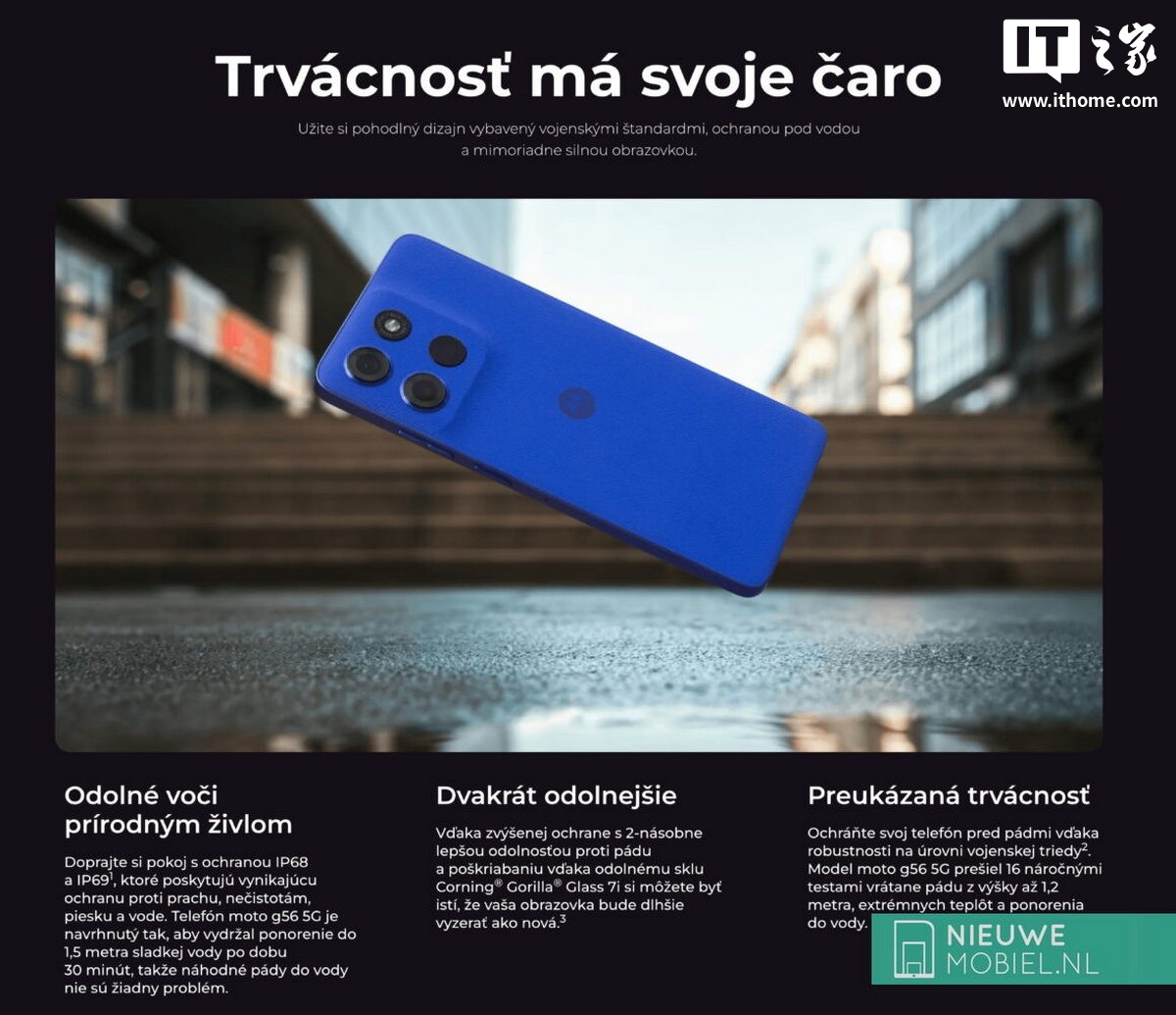 IT之家 5 月 27 日消息,近期摩托罗拉 Moto G56 手机的相关信息频繁泄露,现在该品牌更是在捷克和斯洛伐克的官方网站上意外地提前列出了这款手机,不过该页面很快被撤下。