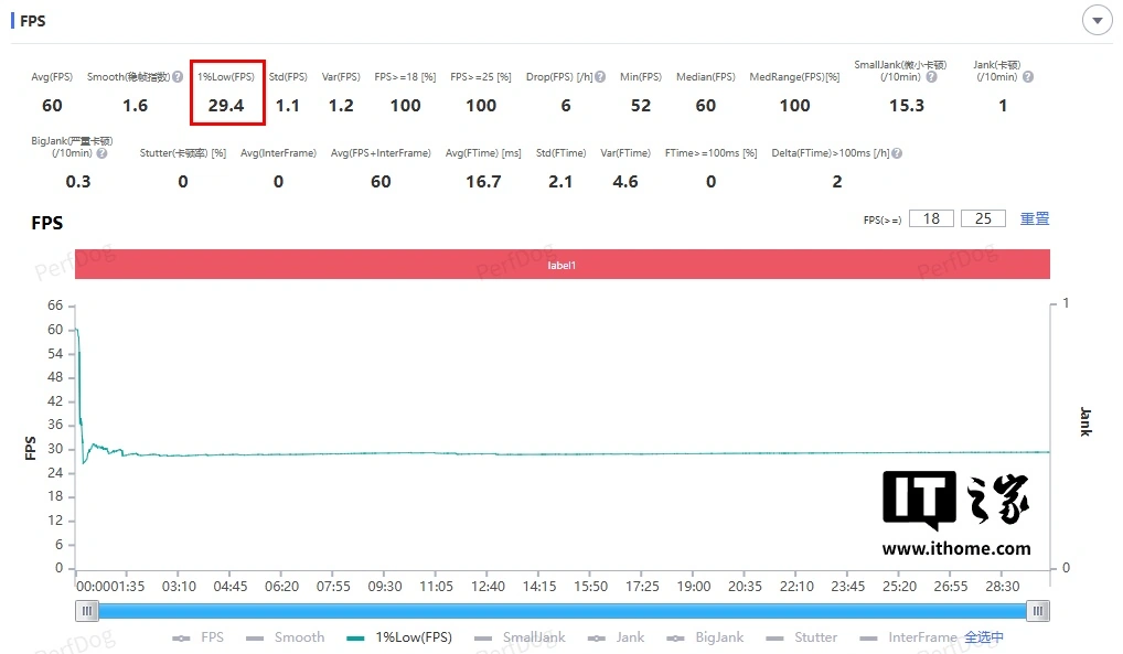某天玑 9400 处理器手机的《原神》1% Low 帧为 29.4 帧;
