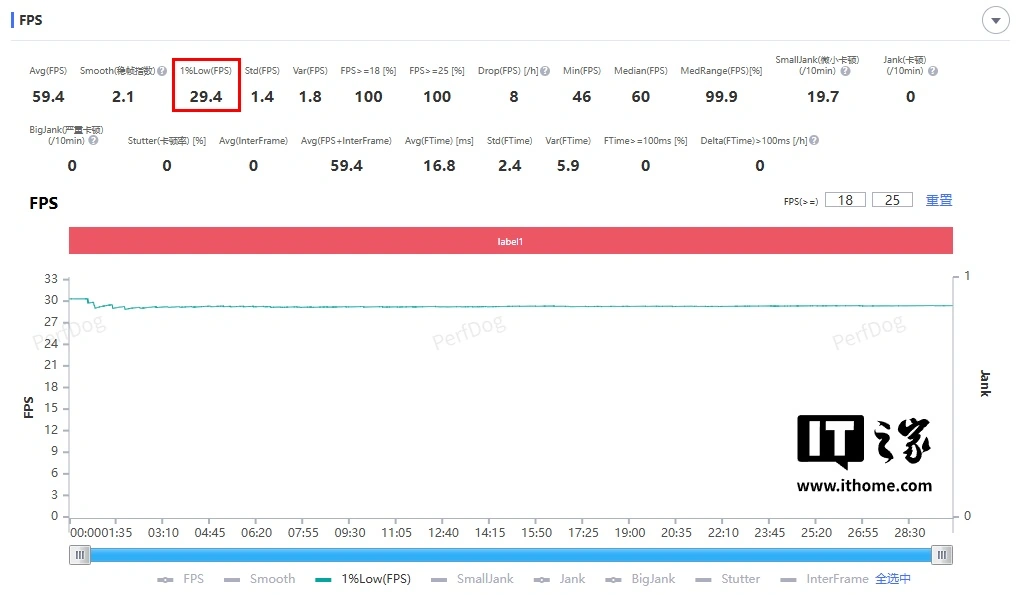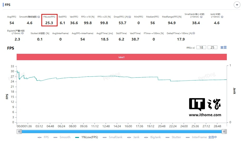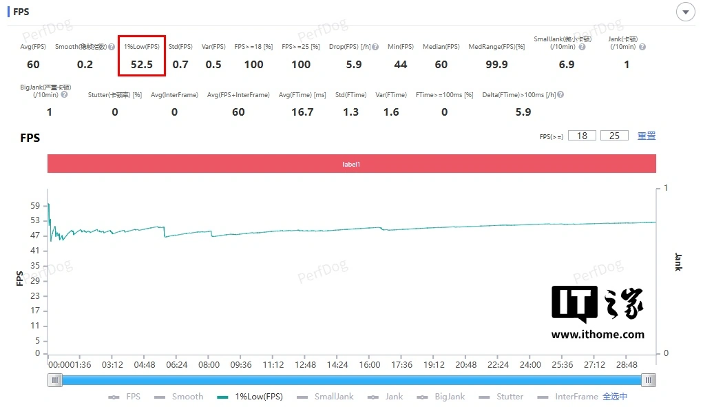 相比之下,另外两台手机在平均游戏帧数上分别是 59.4 帧和 54 帧,看起来相差无几,但游戏的 1% Low 帧表现就比较惨了,均低于 30 帧,实际的游戏流畅度表现肯定也打不过一加 Ace 5 至尊版,那么现在大家还会觉得 3 台手机的游戏表现一样吗?