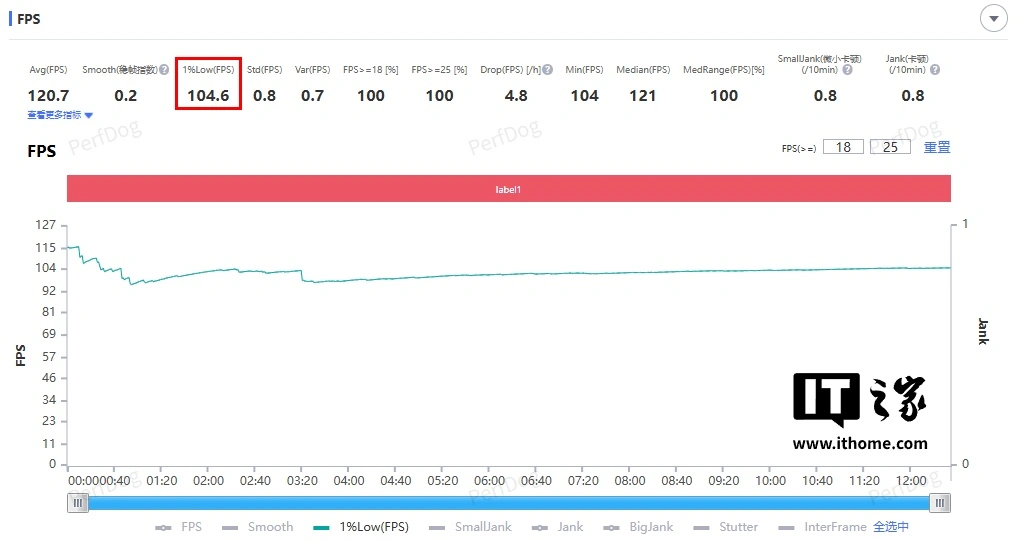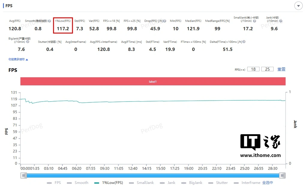 至于 1% Low 帧的表现上,一加 Ace 5 至尊版达到了 117 帧依旧保持领先,另外两台手机的 1% Low 帧与一加 Ace 5 至尊版相比还是稍逊一筹。