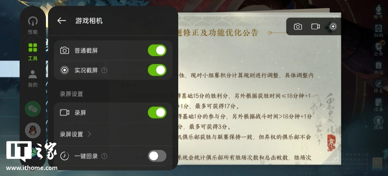 游戏助手中也新增了「游戏相机」、「静音启动」等便捷功能,以「游戏相机」为例,支持 30/15 秒一键回录,即便未提前开启录屏,也能轻松捕捉游戏中的精彩瞬间,且不受游戏类型限制。同时,它还支持 3 秒实况照片拍摄,让游戏画面的记录灵活多样。