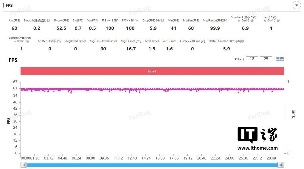 咱们再看另一款游戏《崩坏:星穹铁道》的性能表现,不得不说这款游戏对于手机芯片的性能压力依旧惊人,一加 Ace 5 至尊版在匹诺康尼星球-黄金的时刻地图进行 30 分钟的跑图,游戏帧率曲线整体平直,最终的游戏平均帧数为 59.7 帧。