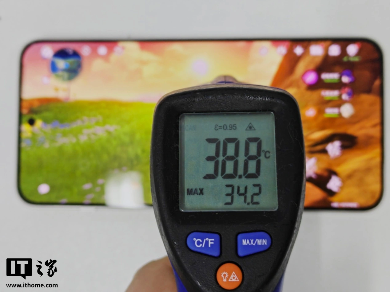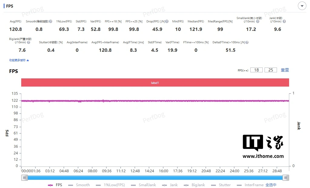 最后我们看看《王者荣耀》的表现,在进行 30 分钟对战后帧率曲线拉成一条直线,平均帧数为 120.8 帧,手机表面最高温度为 36℃。