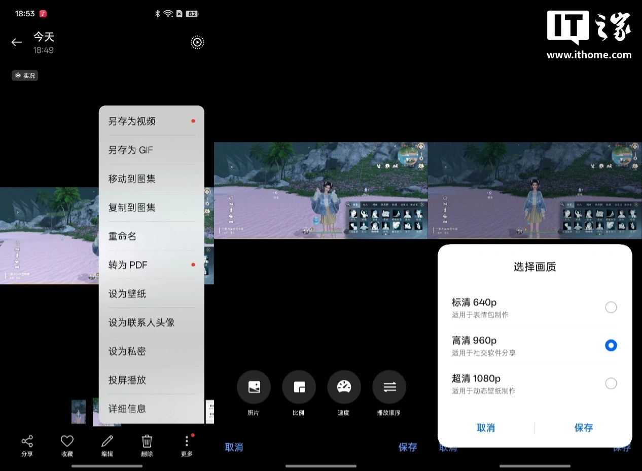 更重要的是,当你在相册中打开游戏相机拍摄的 3 秒实况照片和 15 秒的回录视频后,还可以一键转换为 GIF,自定义选项非常丰富,可以修片、调节比例和速度等,保存时还会提供 3 种清晰度的选项,满足不同的场合和需求。分享欲强或者喜欢拿游戏画面做动态壁纸的朋友,这个功能强烈安利你们试试。
