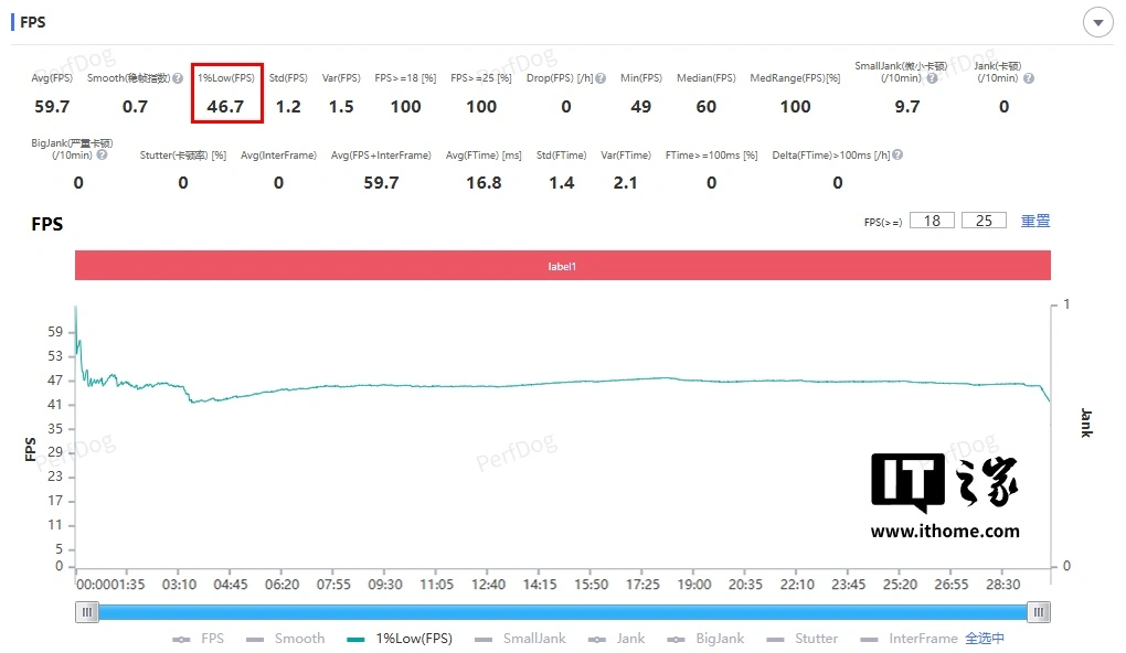 而在《崩坏:星穹铁道》游戏的 1% Low 帧表现上,一加 Ace 5 至尊版最终成绩是 46.7 帧,也是处在一个高位的。