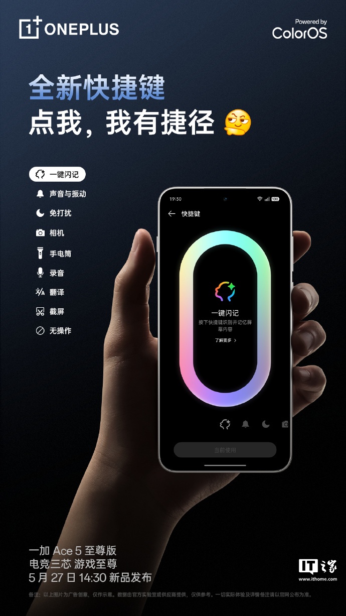 一加 Ace 5 至尊版机身左侧配备了一枚独立的「快捷键」,在保留静音、振动、响铃等情景切换功能的同时,新增了一键闪记、一键静音、一键翻译、一键录音等 8 种功能的自定义设置。