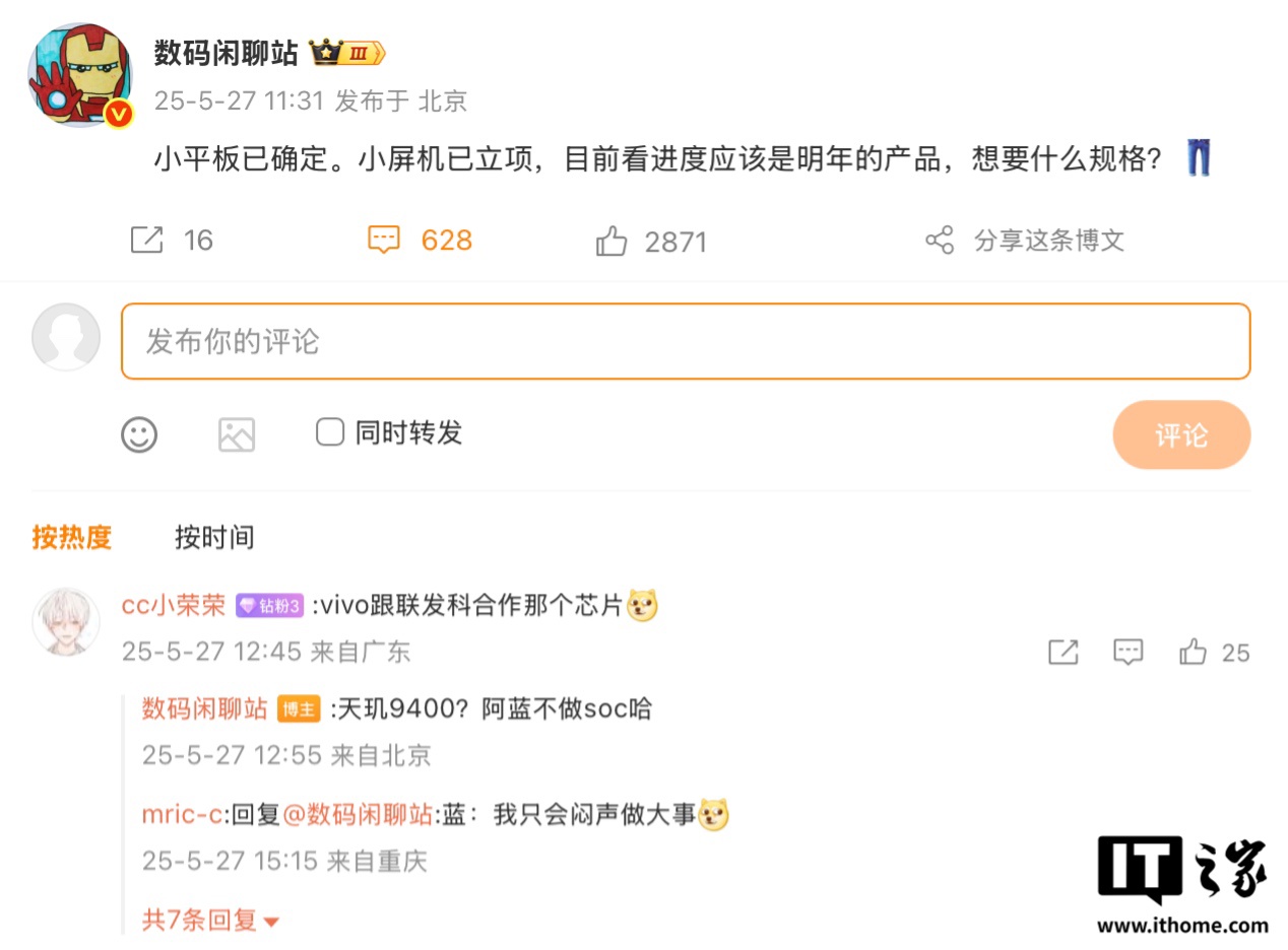 IT之家 5 月 27 日消息,博主 @数码闲聊站 发文,透露 iQOO 旗下小平板已确定、小屏机已立项,相应产品将在明年发布,此外该博主还在评论区透露 vivo“不做 SoC 哈”。