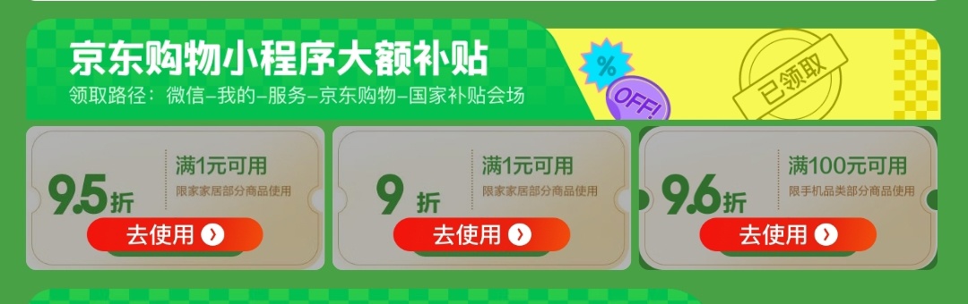 领取 9.6 折券:【京东购物】微信小程序-点击上方【国家补贴】-进入页面后领取: