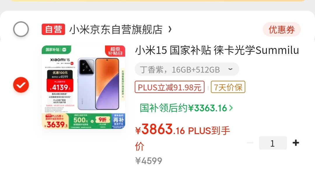 京东小米 15 手机 16+512G3363.16 元直达链接