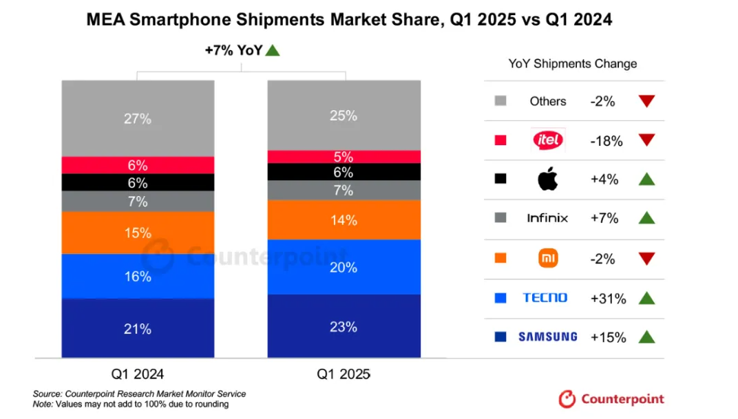 文章来源于互联网:IT之家-Counterpoint:2025 年 Q1 中东非洲智能手机出货量增长 7%,传音、三星、小米前三