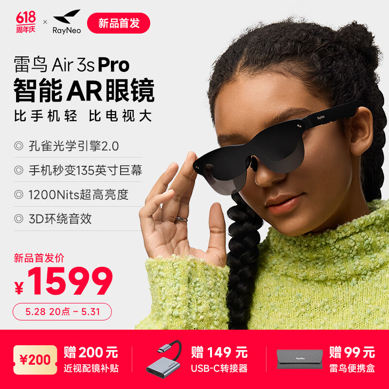 京东雷鸟【雷鸟超级新品】RayNeo Air 3s Pro 智能 AR 眼镜 智能眼镜 高清巨幕观影眼镜 XR 眼镜券后 1549 元领 50 元券