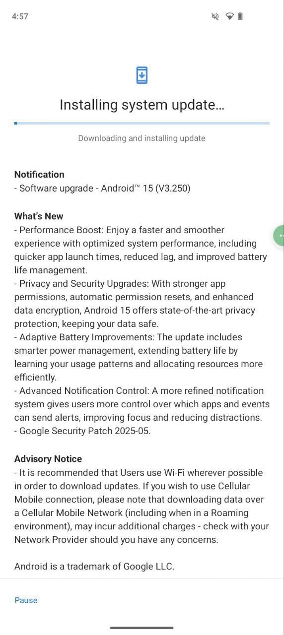 据官方 Discord 频道消息,此次更新已率先在印度地区展开,固件版本为 AQ3A.241114.001/00WW_3_250。
