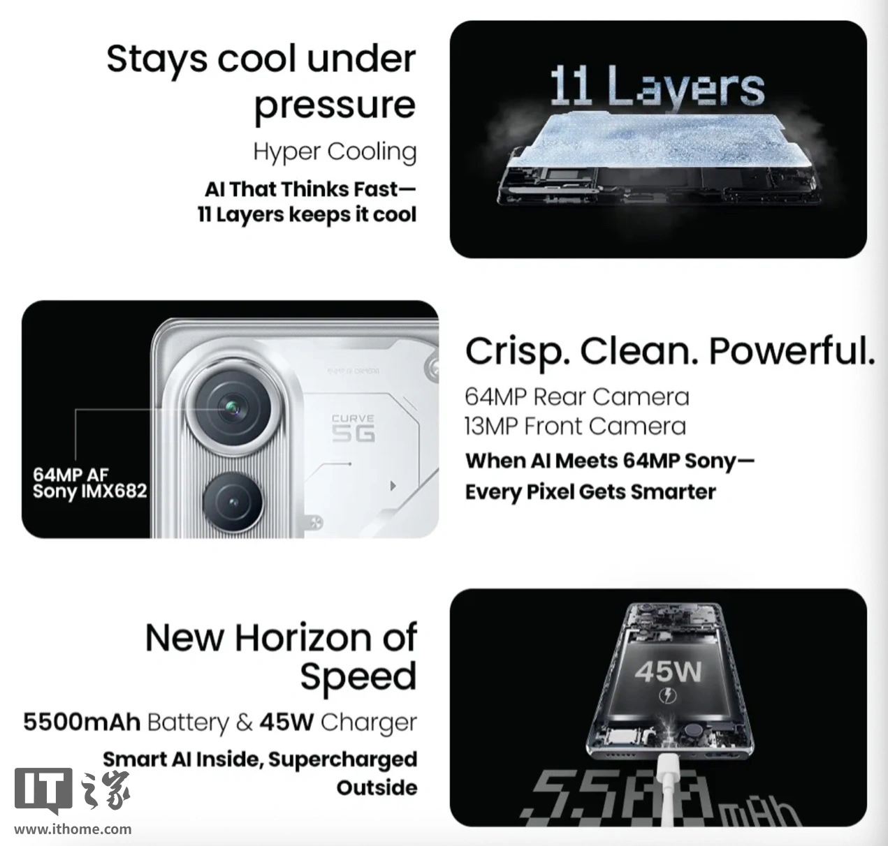 Pova Curve 内置 5500mAh 电池,支持 45W 有线充电,获 TÜV 莱茵 1800 次以上充电循环认证,防护等级为 IP64(IT之家注,仅防尘防溅),官方称产品采用“11 层”散热。影像方面,产品配备 6400 万像素 1/1.73 英寸索尼 IMX682 主摄、200 万像素景深摄像头和 1300 万像素前置摄像头。
