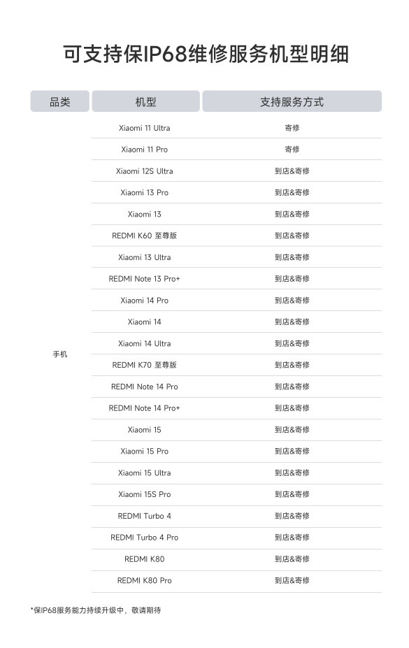 IT之家从官方海报获悉,保 IP68 服务是指在手机出厂符合 IP68 标准的前提下维修后依旧可达到该标准,不支持无故障的手机仅检测 IP68 完好性服务。