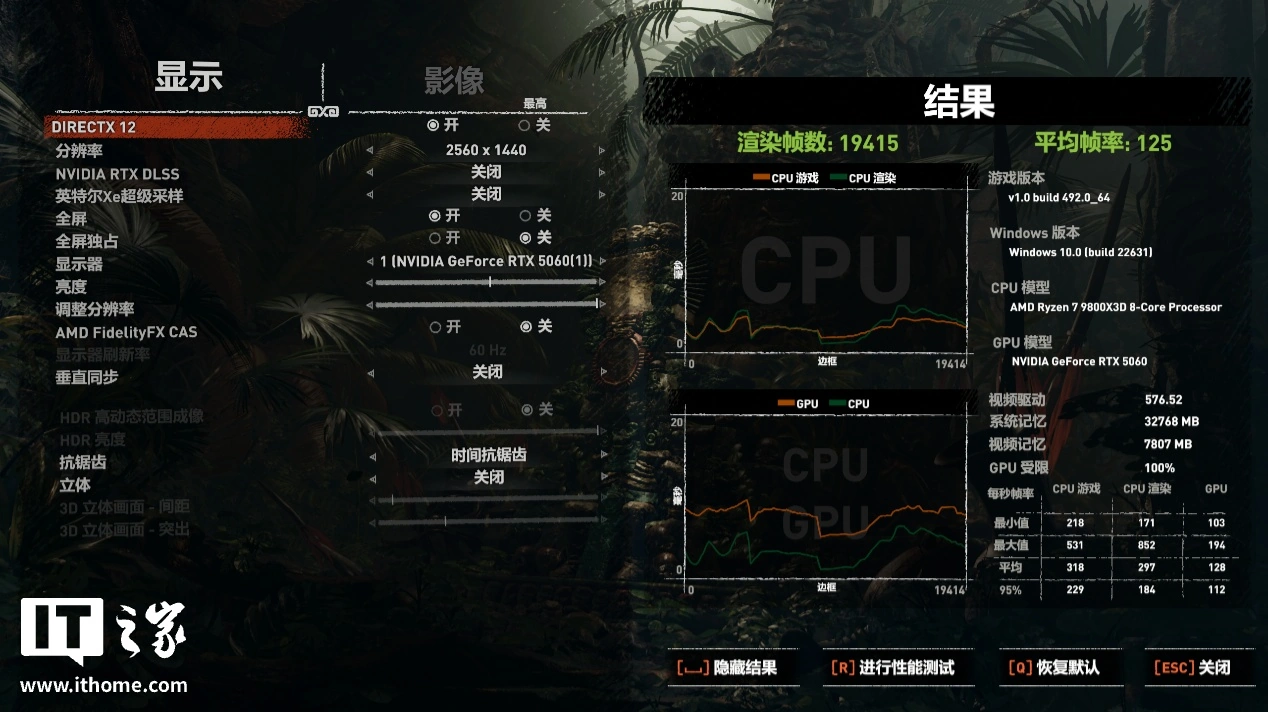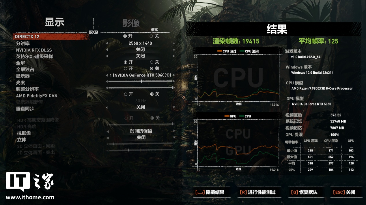 RTX 5060 在 2K 分辨率 + 最高画质下,游戏平均帧数 125 帧,1% Low 帧 89 帧;