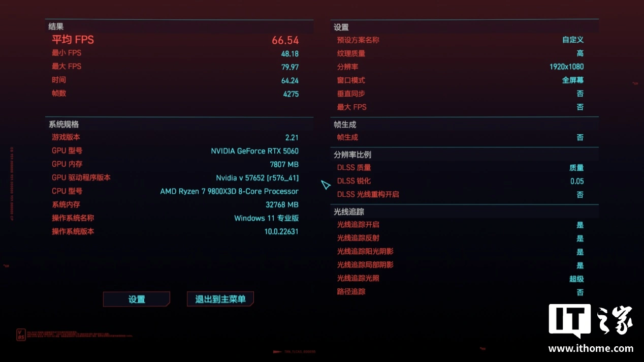 在《赛博朋克:2077》中,1080P 分辨率 + 超级光追画质,开启 DLSS 质量档,游戏平均帧数能达到 66 帧,但由于 1% Low 帧只有 45 帧左右,玩起来还是不够流畅。