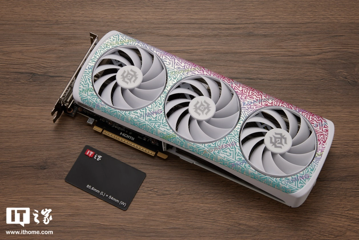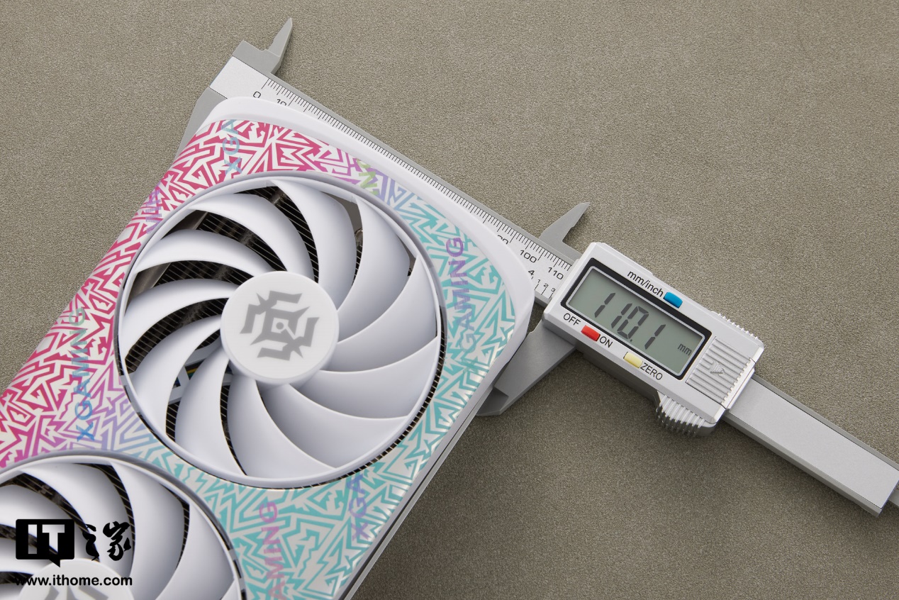 索泰 GeForce RTX 5060 8GB XGAMING OC 显卡采用了玫红 + 绿色渐变风格的涂鸦配色,装甲上的印花图案色彩鲜明,时尚活泼,纯白扇叶则中和了一些渐变色的视觉冲击,适合喜欢鲜艳配色、装机风格大胆的玩家。