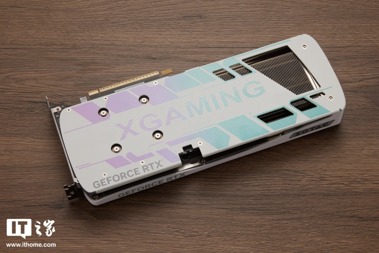 显卡背板采用铝合金加固处理,底色为纯白,上下部分各做了一条不规则的渐变装饰图案,全大写 XGAMING 字符和斜切渐变装饰极具个性。