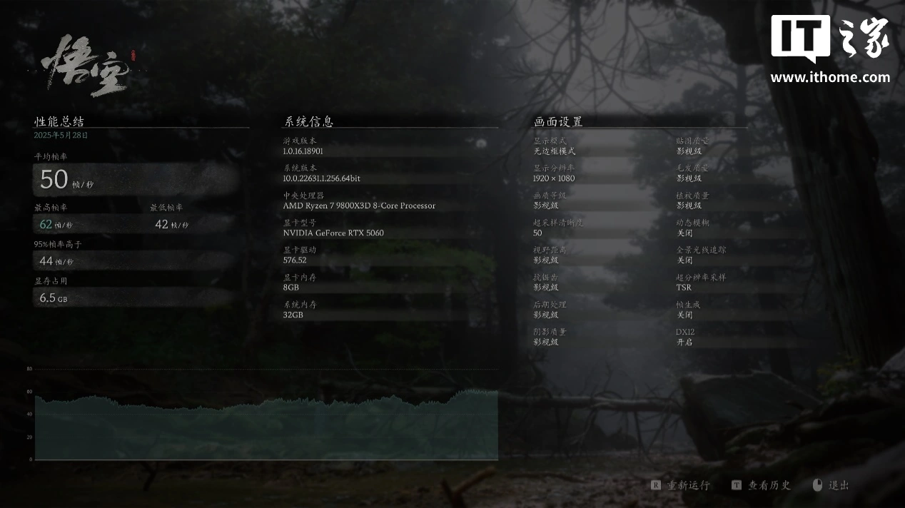 在 1080P 分辨率下关闭光追,使用影视级画质 + 50% 超采样分辨率 + TSR,游戏平均帧数只有 50 帧,更别提 1% Low 帧只有 45 帧了,很显然最高画质的性能压力对 RTX 5060 显卡还是有点难。