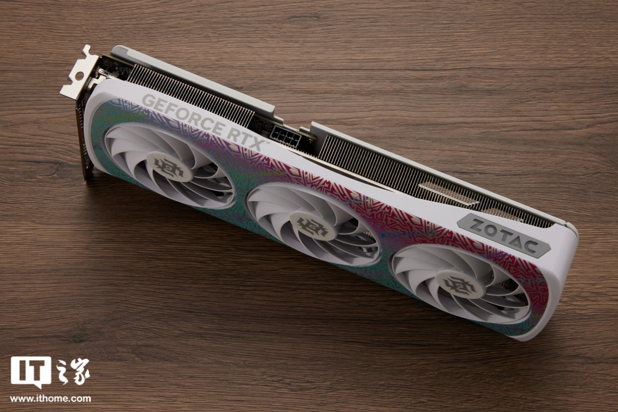 显卡两侧都做了流线型的外壳包裹,进一步突显其圆润风格,顶侧印有 GEFORCE RTX 标志和会发光的 ZOTAC Logo 灯牌,支持 RGB 灯效。单 8pin 接口自然也是标配。