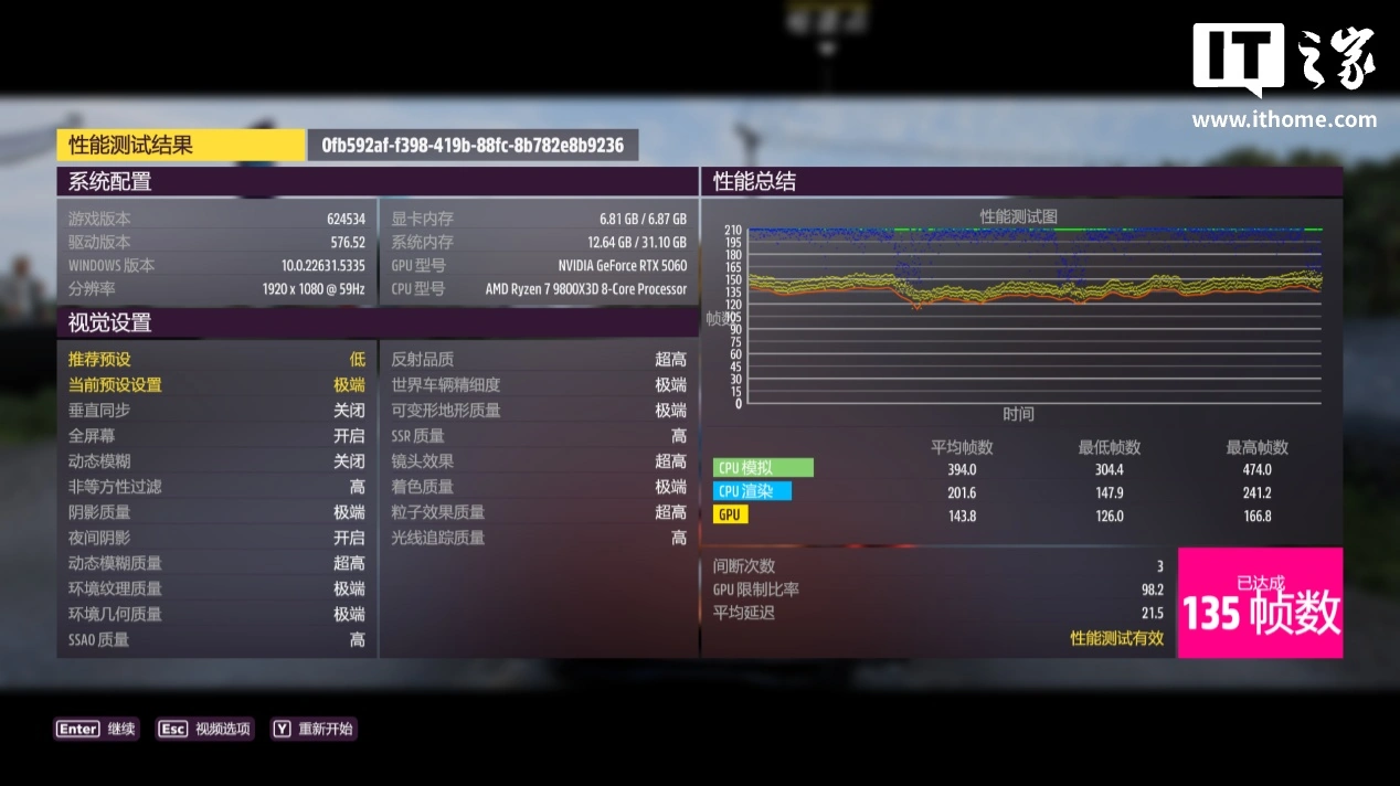 RTX 5060 在 1080P 分辨率 + 极端画质下,游戏平均帧数 135 帧,1% Low 帧 108 帧;