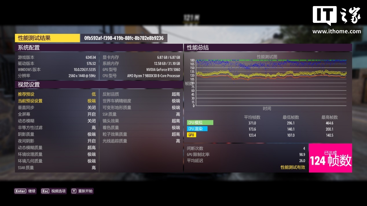 RTX 5060 在 2K 分辨率 + 极端画质下,游戏平均帧数 124 帧,1% Low 帧 96 帧;