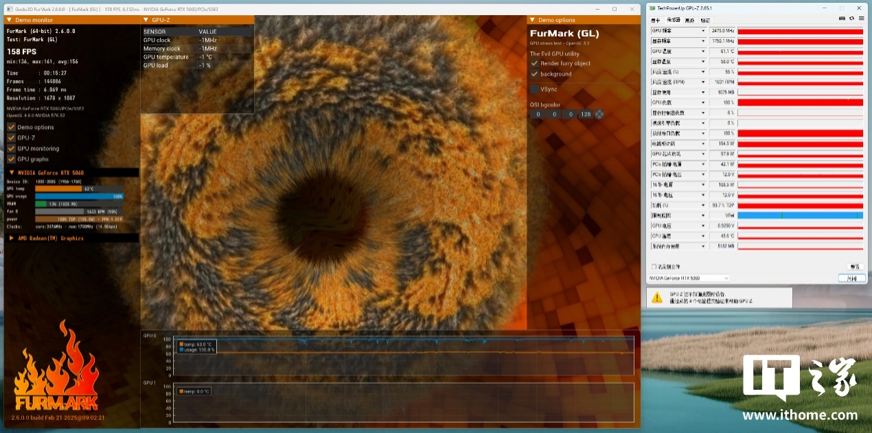 我们通过 FurMark 进行了 15 分钟烤机后可以看到,此时的 GPU 功耗稳定在 155W 左右,比标称多出 10W。烤机时的 GPU 主频在 2475MHz 左右,与此同时显卡核心温度只有 61℃,显存温度更是低至 58℃,可见在三封扇散热模具加持下,压住 RTX 5060 核心非常轻松。