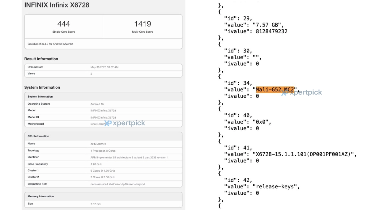 根据跑分库页面信息,Infinix Hot 60i(型号 X6827)搭载一颗八核芯片,其中两个核心主频为 2GHz,另六个核心主频为 1.70GHz,搭配 Mali-G52 MC2 GPU。