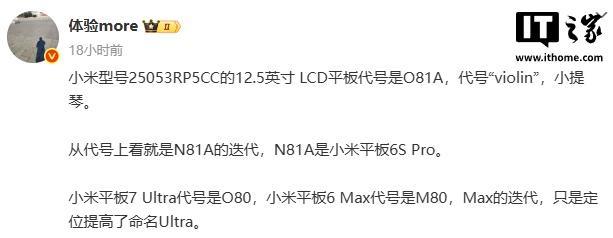 IT之家 6 月 1 日消息,博主 @体验more 昨日爆料称,小米型号 25053RP5CC 的 12.5 英寸 LCD 平板代号是 O81A,代号“violin(小提琴)”。从代号上看就是 N81A 的迭代,而 N81A 是小米平板 6S Pro。