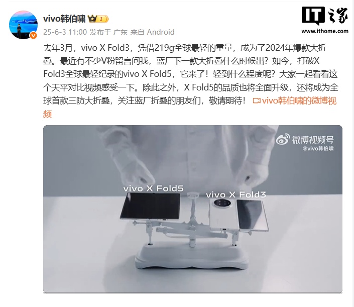 刚刚 vivo 产品经理韩伯啸放出了 vivo X Fold5 的一些信息,称 vivo X Fold5 将打破 X Fold3(219g)全球最轻大折叠(内折)手机纪录。同时,新机品质全面升级,将成为全球首款三防大折叠。