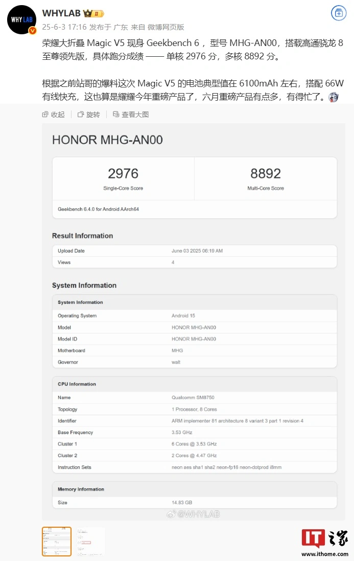 IT之家 6 月 3 日消息,型号为“MHG-AN00”的荣耀手机已现身 Geekbench 跑分库,其单核得分 2976、多核得分 8892,搭载高通骁龙 8 至尊领先版处理器。博主 @WHYLAB 发文透露,该机为荣耀大折叠手机 Magic V5。