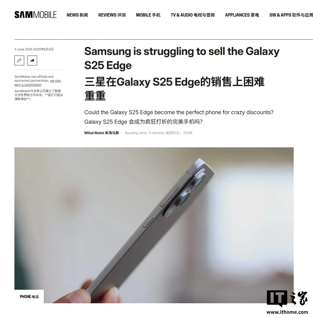 IT之家 6 月 4 日消息,据专注报道三星相关新闻的外媒 SamMobile 报道,三星寄希望于 Galaxy S25 Edge 能够为低迷的手机市场注入新的活力,并为公司乃至整个行业开辟新的收入来源。然而,这款备受瞩目的超薄新机似乎并未能完全实现三星的宏伟愿景,甚至可能从一个美好的梦想沦为一场噩梦。