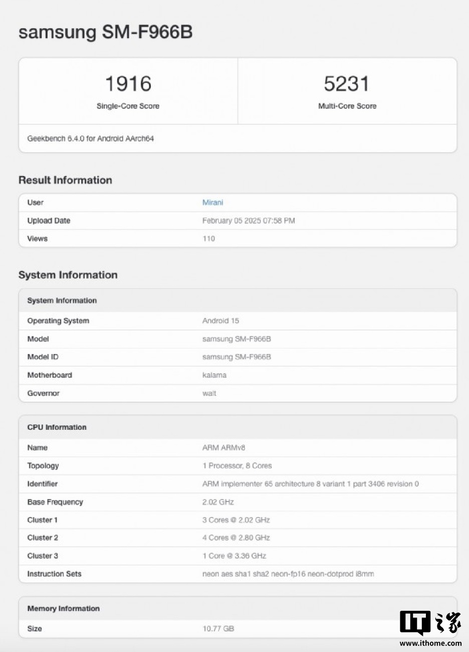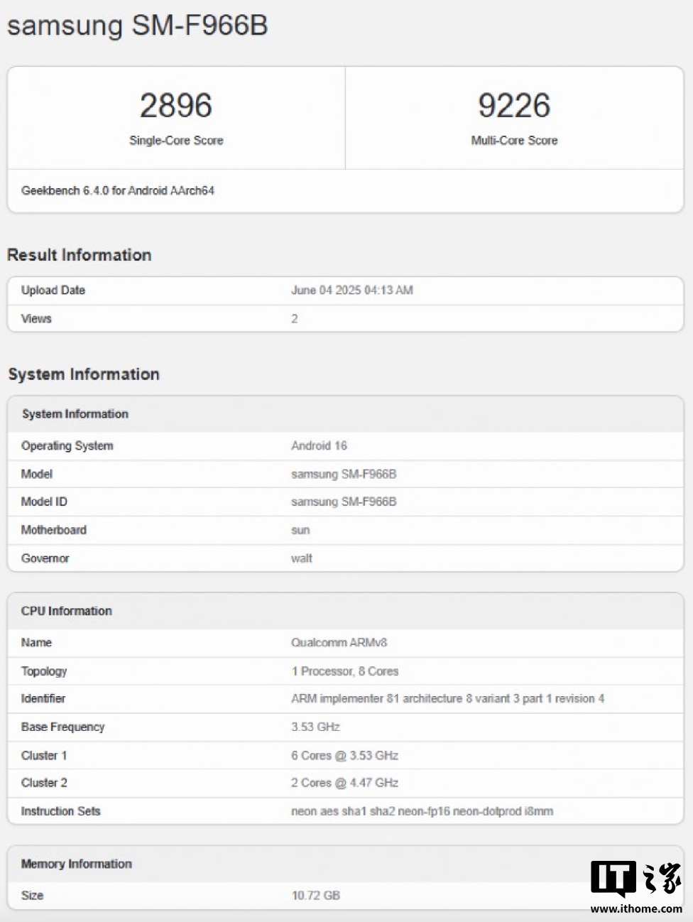 IT之家 6 月 4 日消息,一款型号为 SM-F966B 的三星新机今日现身 Geekbench 跑分数据库,该机预计为 Galaxy Z Fold7 全球版,多核跑分最高 9226 分。