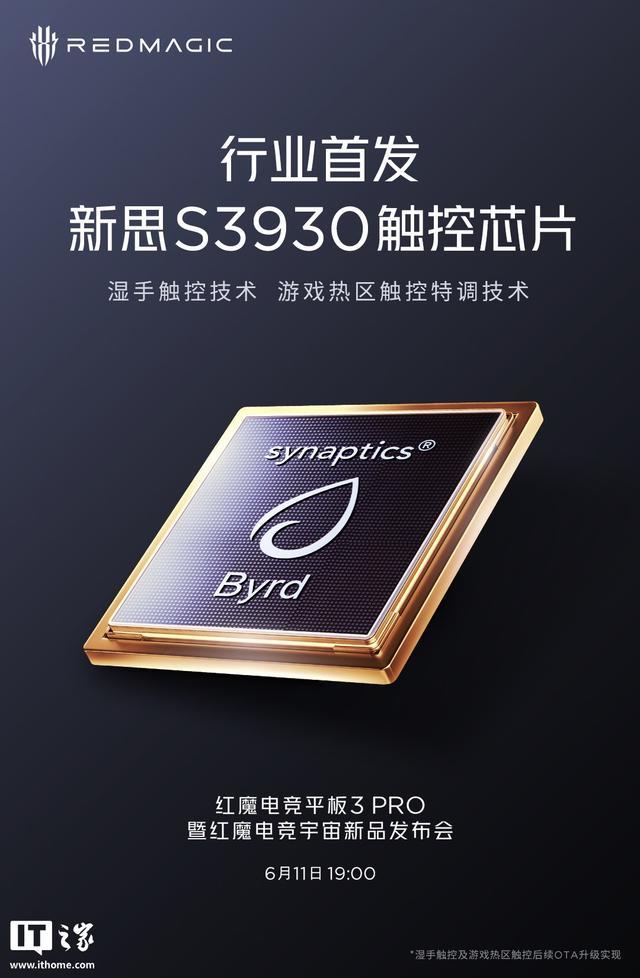 IT之家 6 月 5 日消息,红魔电竞平板 3 Pro 暨红魔电竞宇宙新品发布会已定档 6 月 11 日 19:00。官方正持续预热新机,红魔电竞平板 3 Pro 已确定行业首发新思 S3930 触控芯片,支持游戏热区触控特调。