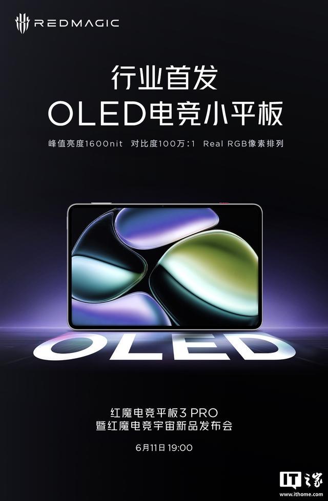 据红魔游戏手机官方预热,红魔电竞平板 3 Pro 将配备 165Hz 超竞屏,并号称“行业首发 OLED 电竞小平板”,其屏幕峰值亮度 1600nit、对比度 100 万:1、并采用 Real RGB 像素排列。