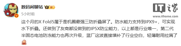 IT之家 6 月 6 日消息,vivo X Fold5 折叠屏手机现已开启预热,预计将于近期发布。据博主 @数码闲聊站 今日爆料称:“X Fold5 属于是机圈最强三防折叠屏了”。