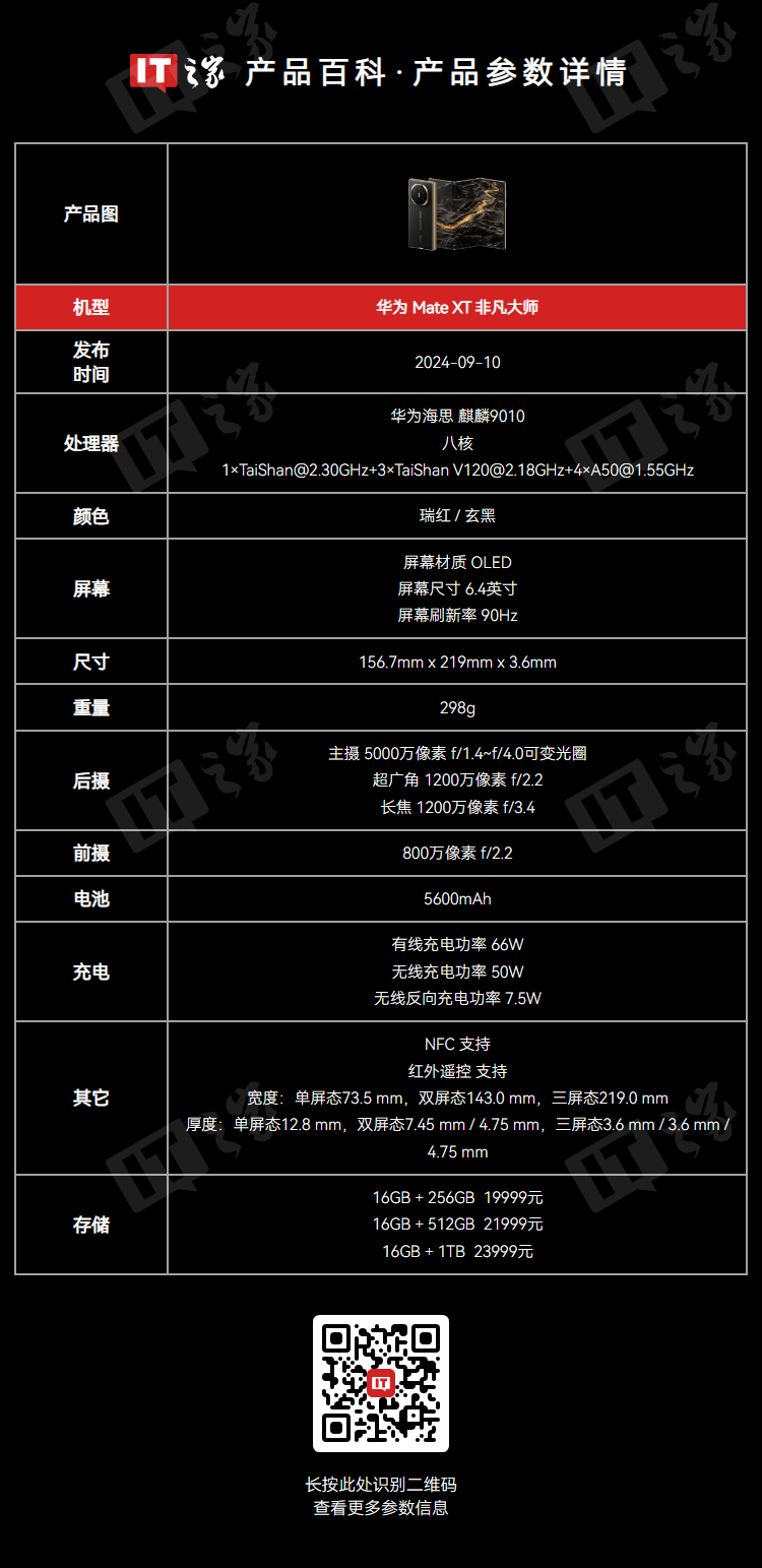 根据IT之家此前报道,华为 Mate XT | ULTIMATE DESIGN 三折叠手机发布于 2024 年 9 月 10 日,是全球首款量产三折叠手机,有瑞红、玄黑两款配色,搭载华为“天工”铰链系统,屏幕部分采用非牛顿流体材料,配有 5600mAh“全球最薄硅负极大容量电池”;有 16+256GB、16+512GB、16+1TB 三种配置可选,售价 19999 元起。
