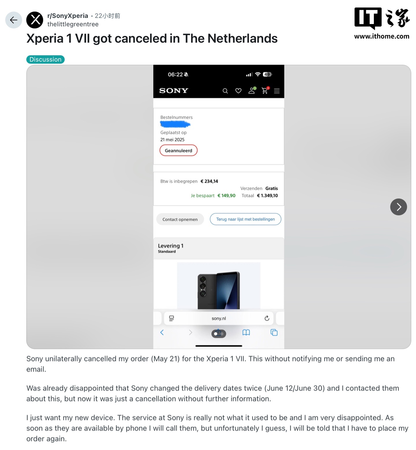 文章来源于互联网:IT之家-海外用户抱怨索尼 Xperia 1 VII 手机预售订单随机砍单,致赠品 XM5 耳机无法获得