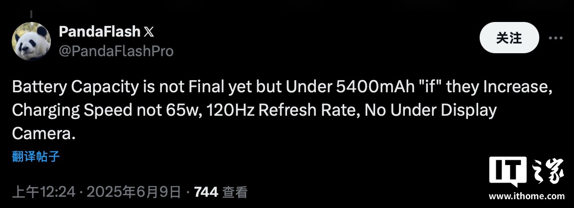 爆料人 PandaFlashPro 今日在 X 平台称,目前 S26 Ultra 的电池容量仍未最终确定,如若升级,容量不会超过 5400mAh,也不会升级 65W 充电和屏下摄像头,刷新率保持 120Hz。